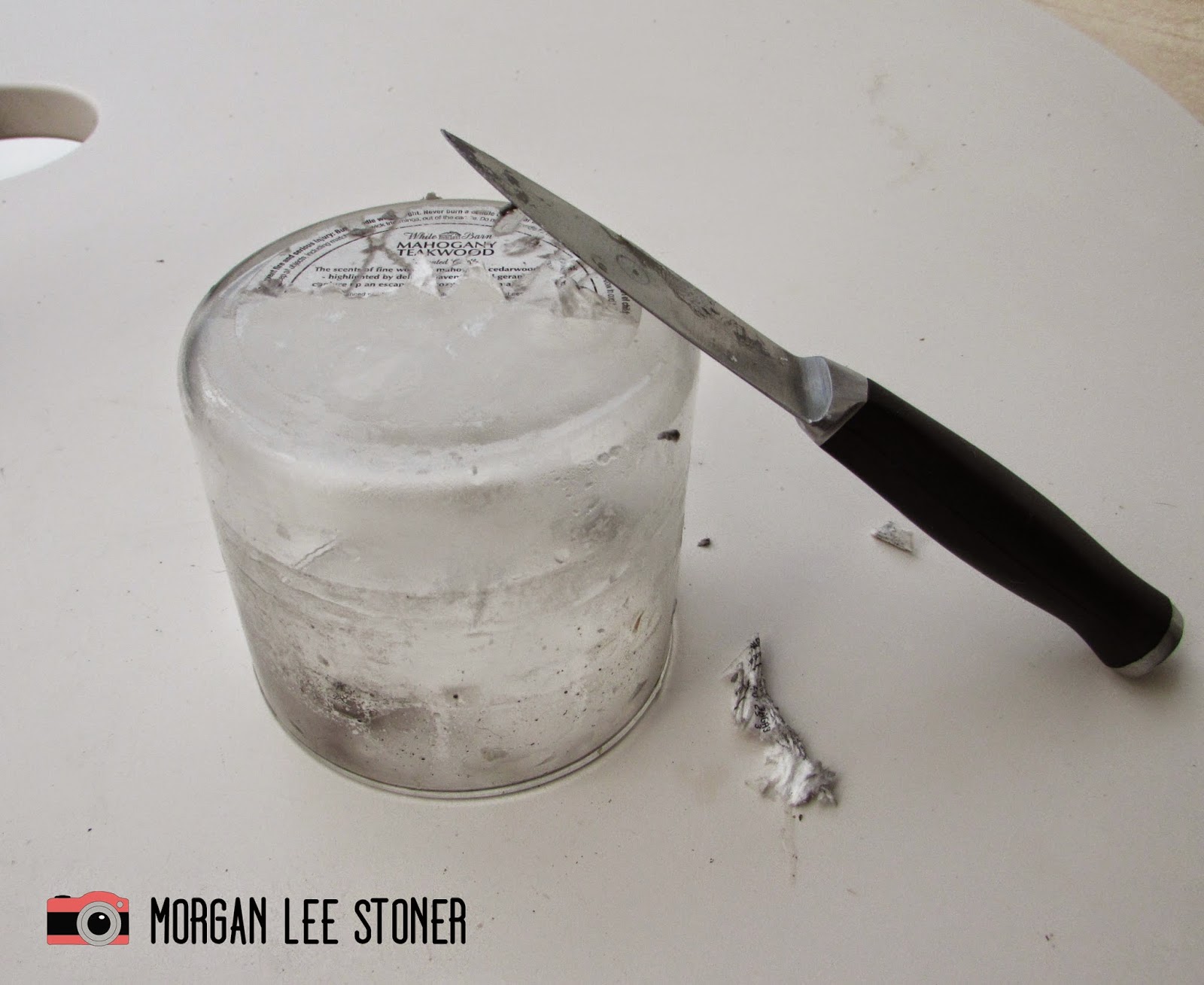 Start with a brunt-out candle that has been sitting in the freezer for a few hours. The freezer step is important as the wax is much easier to remove from the jar when it’s frozen.